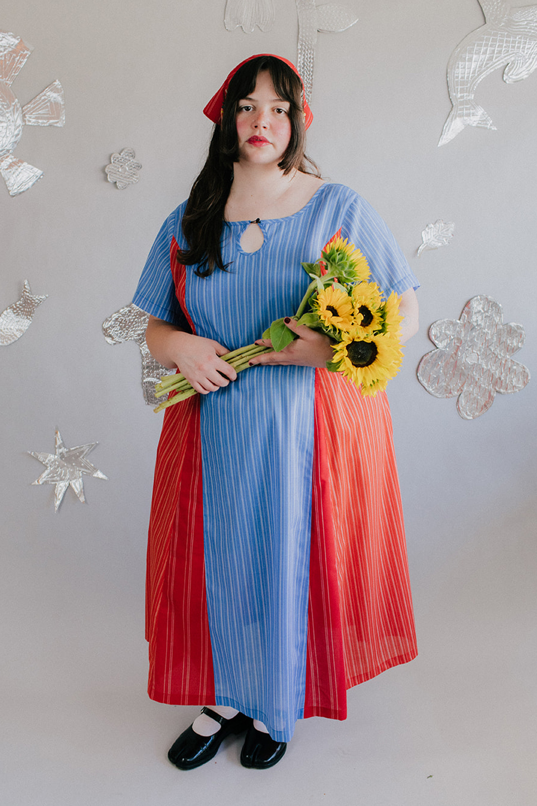 The Market Day Dress is a Princess seam maxi dress in light striped cotton deadstock fabric. Keyhole detailing at neck highlights a vintage button. The perfect summer dress, the princess seams perfectly shape and skim your body with a more relaxed waist to allow for comfort and movement but with a back tie so the waist can be cinched in to your liking. Handmade in 3 complementary 100% cotton stripes, and a godet panel for extra flare.