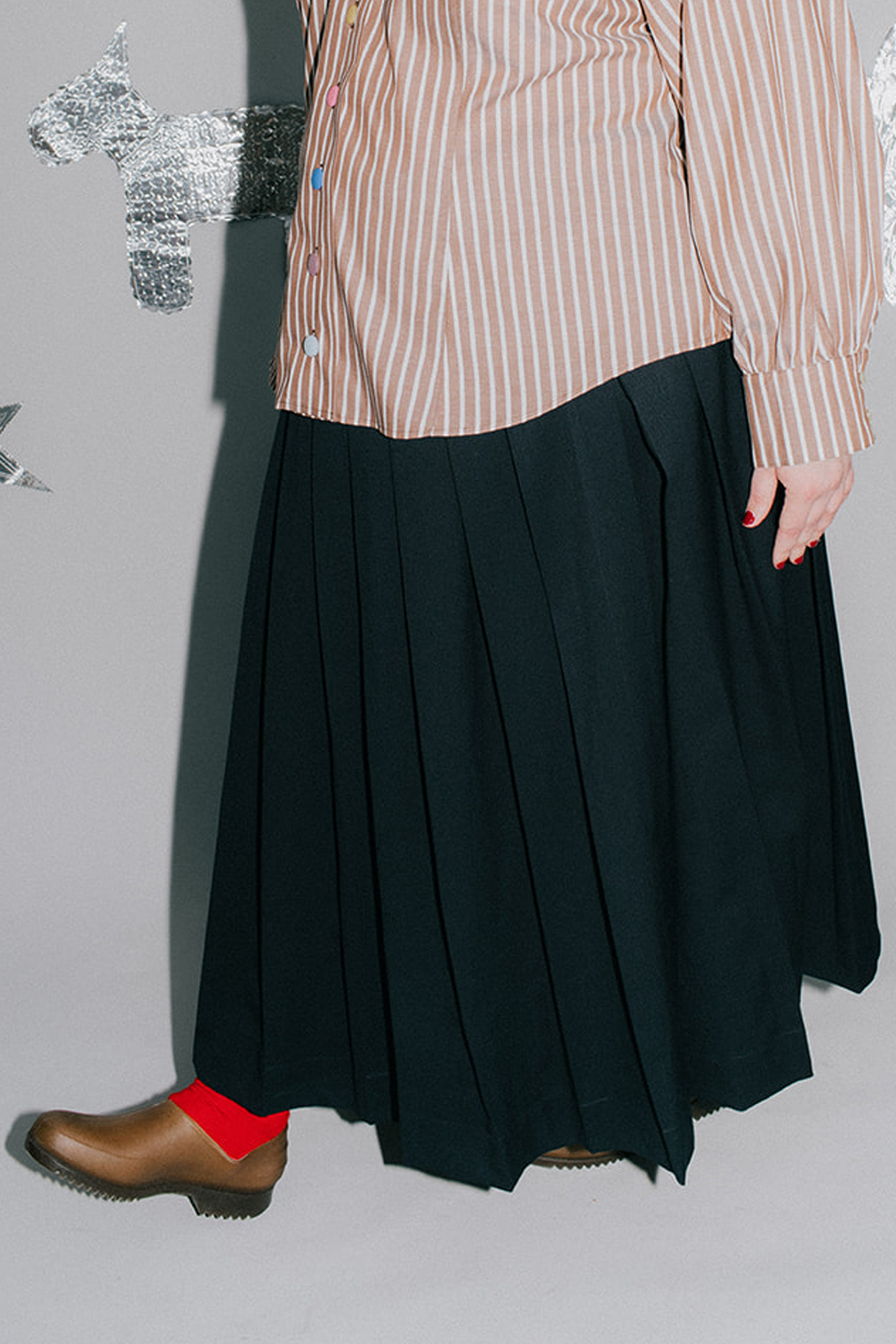 The Nora Kilt is bound to become a staple in your wardrobe. Constructed in a soft midnight navy wool or dark grey olive mohair/wool, this kilt is pleated all round the front with dart shaping at the back, overlapping wrap front with inner button closure and handmade leather kilt strap. This kilt possesses a subtle elegance and poise that makes it a new classic.